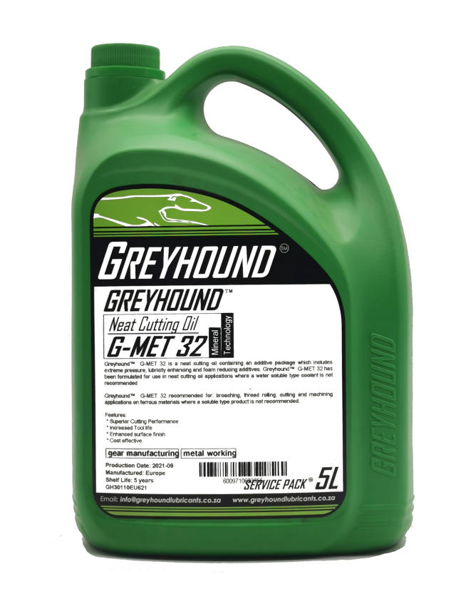 Greyhound G-Met 32 neat cutting oil containing an additive package that includes extreme pressure, lubricity enhancing and foam reducing additives. Greyhound™ G-MET 32 has been formulated for use in neat applications where a water-soluble type coolant is not recommended. Greyhound™ G-MET 32 is recommended for broaching, thread rolling, cutting and machining applications on ferrous materials. Our product helps you increase productivity and performance, as well as maintain high surface-finish levels and dimensional accuracy.