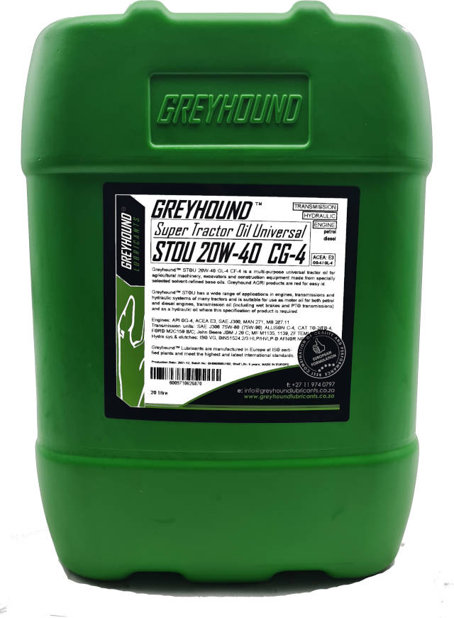 Greyhound™ STOU 20W-40 oil is the trademark of a line of high-quality universal series of STOU (Super Tractor Oil Universal). The oil is designed for naturally aspired, turbocharged, and supercharged engines, mechanic transmissions, and hydro systems (hydro and hydraulic clutches) for agricultural machinery, excavators, and construction machinery.