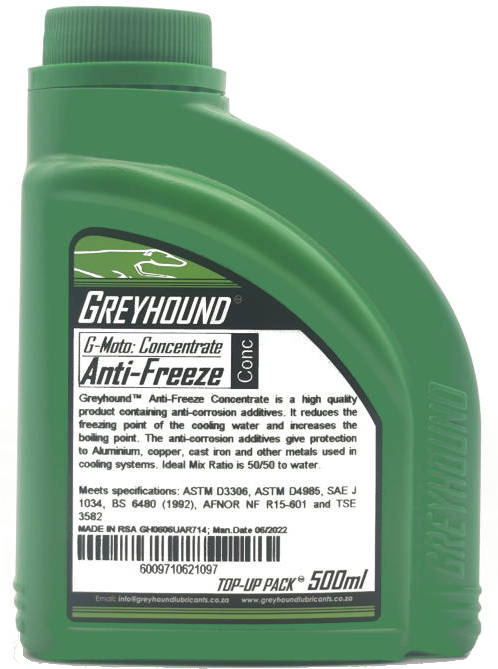 Greyhound Anti-Freeze Concentrate is a high-quality product containing anti-corrosion additives. It reduces the freezing point of the cooling water and increases the boiling point. The anti-corrosion additives give protection to Aluminium, copper, cast iron and other metals used in cooling systems. Greyhound™ anti-freeze is suitable for use in almost all types of motor vehicle and motorcycle cooling circuits. The product has been formulated using pure (98%) premium MEG (Mono Ethylene Glycol) and coolant package additives. 1 litre of G-MOTO™: Anti-freeze to 1 litre of water – Protection to minus 38 deg C; 1 litre of G-MOTO™: Anti-freeze to 2 litres of water – Protection to minus 18 deg C.
