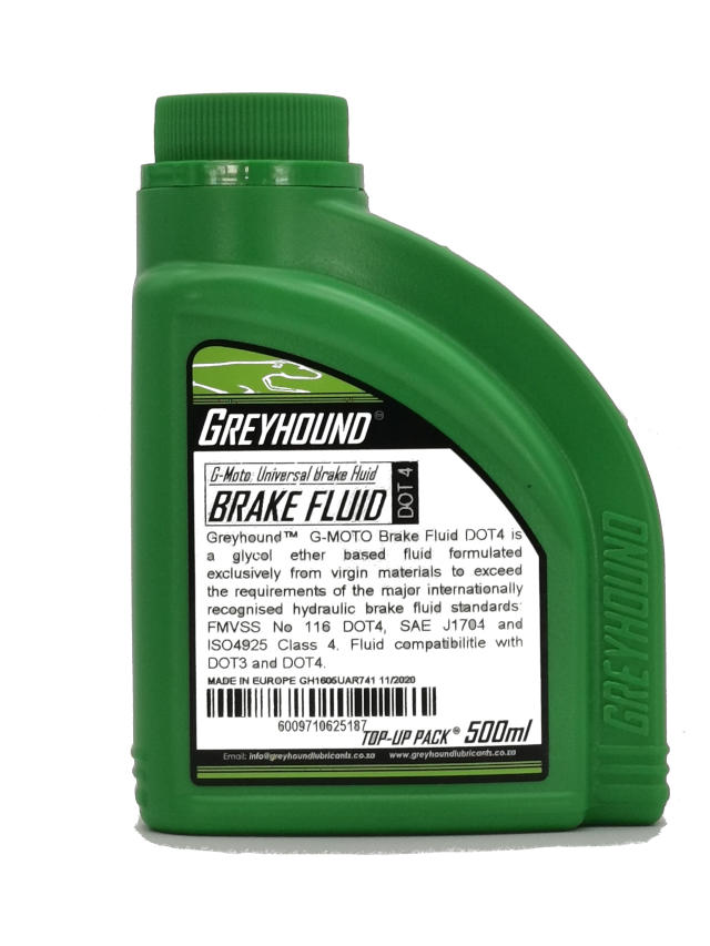 Greyhound™ Brake Fluid DOT 4 is a glycol ether-based fluid formulated exclusively from virgin materials to exceed the requirements of the major internationally recognised hydraulic brake fluid standards: FMVSS No 116 DOT4, SAE J1704 and ISO4925 Class 4. It has all the characteristics required to ensure the safe and reliable operation of vehicle braking systems: High Boiling Point, High Wet Boiling Point, Optimal Viscosity, Corrosion Inhibition, Rubber Compatibility Fluid Stability.